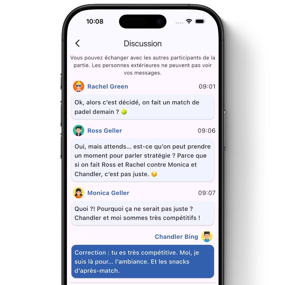 Grâce à la messagerie intégrée, échangez avec les joueurs inscrits à vos parties, planifiez vos rencontres et créez une vraie complicité avant même de monter sur le terrain.